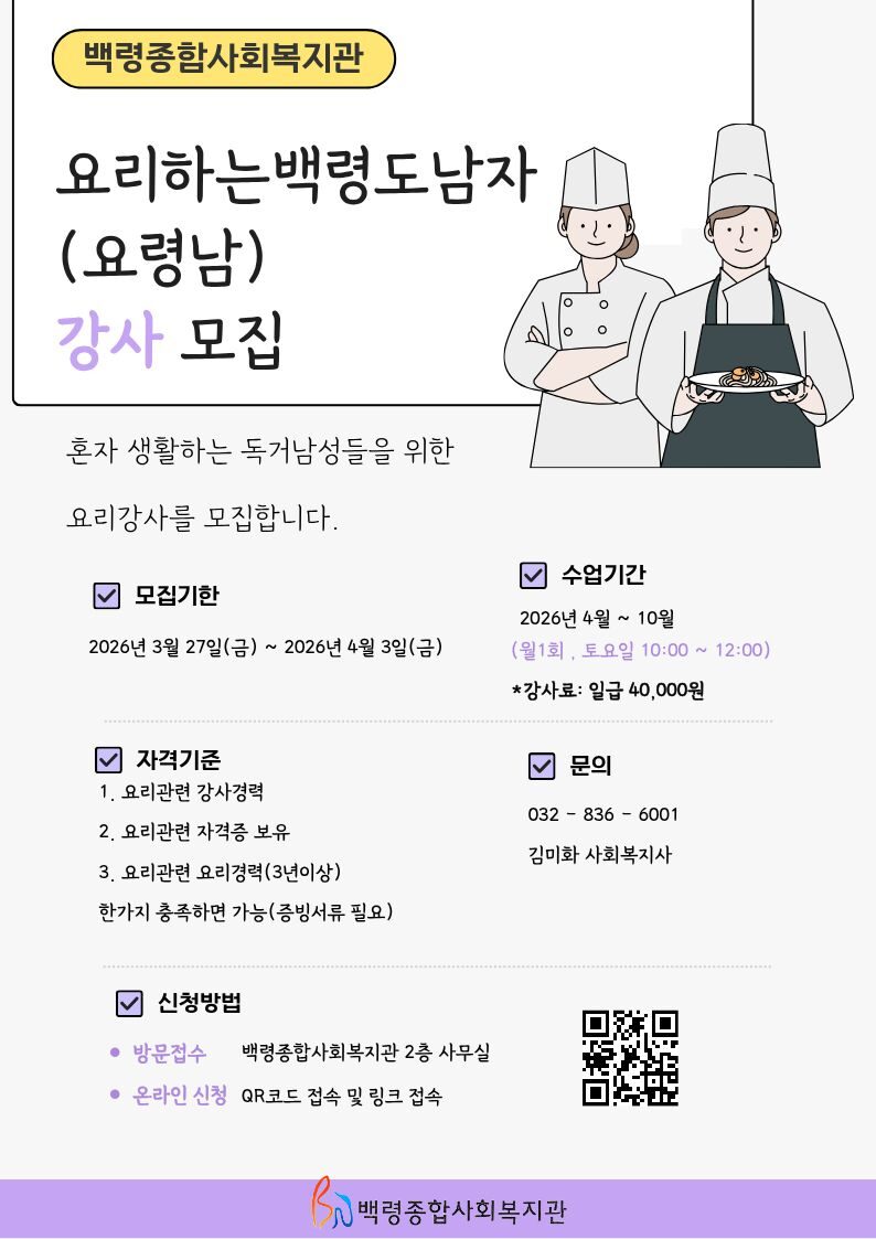 2026년 요리하는 백령도 남자(요령남) 프로그램 강사를 모집합니다.